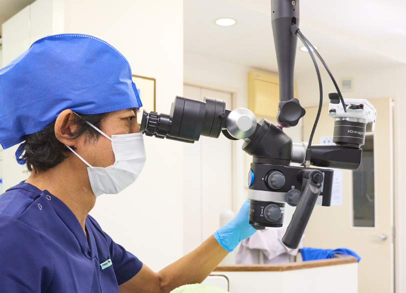 マイクロスコープは、治療する部分を肉眼の最大20倍以上にまで拡大して見ることができる歯科用の顕微鏡です。特に、歯の根の中の細く複雑な管を治療する「根管治療」において、その威力を発揮します。