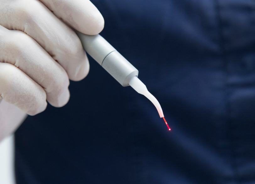 レーザー治療は、特定の波長の光を照射することで、様々な効果を得る治療法です。当院では、主に歯周病治療や口内炎の治療、歯ぐきの黒ずみの除去などに使用しています。レーザーには殺菌効果や消炎効果、鎮痛効果があり、治療中の痛みを抑えることができます。